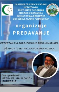U organizaciji Udruženja mladih „Orahovica“, a uz podršku Medžlisa Islamske zajednice Gračanica i džemata Donja Orahovica, u četvrtak će se održati svečano predavanje uvaženog Nezima ef. Halilovića Muderrisa.